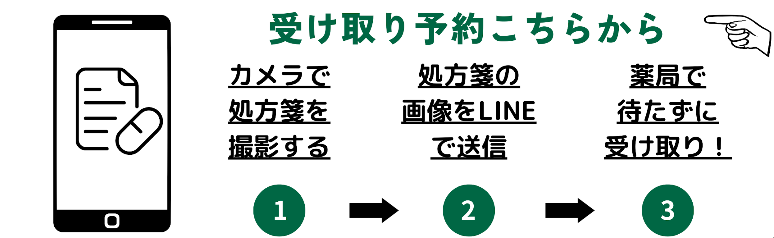 お好きな時間にご来局ください。※必ず処方箋原本を持ってご来局ください。